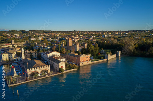 Naklejka premium Aerial view of Lake Garda and the city center of Lazise, Italy. Autumn season, blue sky