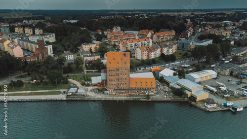 © Belus, Fototapeta premium Aerial view of lake with facilities and boats.
