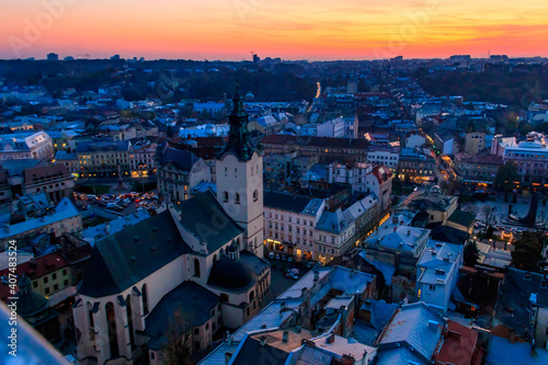 © olyasolodenko, Fototapeta premium Aerial view of Latin cathedral and Rynok square in Lviv, Ukraine at sunset. View from Lviv town hall