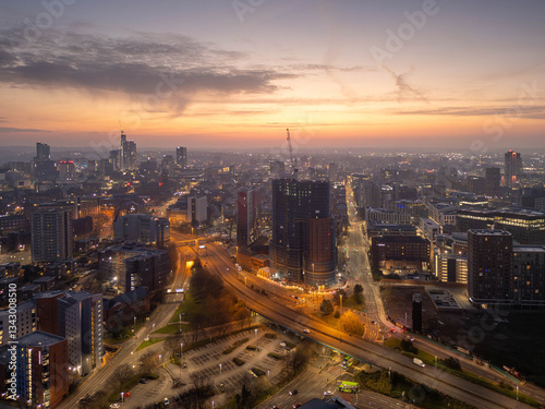 © Cavan, Fototapeta premium Aerial View of Leeds City Centre at Dawn