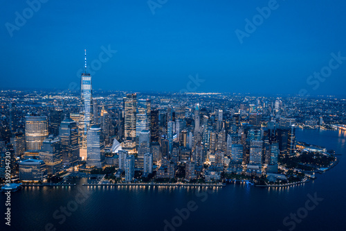 © raoyang, Fototapeta premium Aerial view of lower Manhattan at dusk from Hudson river.