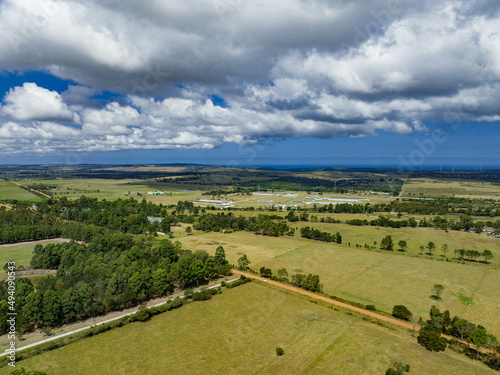 © rushay, Naklejka premium Aerial view of lush fields with dramatic clouds hovering