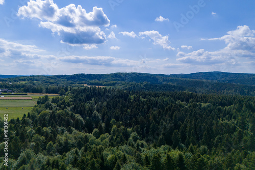 Fototapeta premium Aerial view of lush green forest and fields under a bright blue sky with fluffy clouds creating a serene atmosphere.
