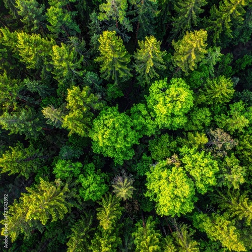 © babang, Fototapeta premium Aerial View of Lush Green Forest Canopy with Diverse Tree Species and Sunlight
