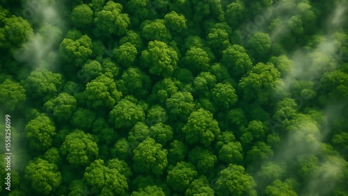 © MehediHasan, Fototapeta premium Aerial View of Lush Green Forest Canopy with Wispy Fog