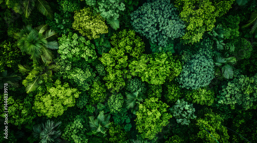 Naklejka premium Aerial view of lush green rainforest canopy with diverse foliage, showcasing vibrant shades of green and dense vegetation