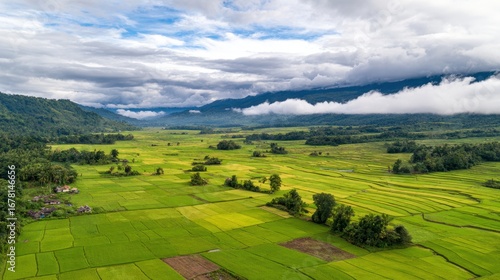 Fototapeta premium Aerial view of lush green rice fields surrounded by mountains and clouds in a serene landscape