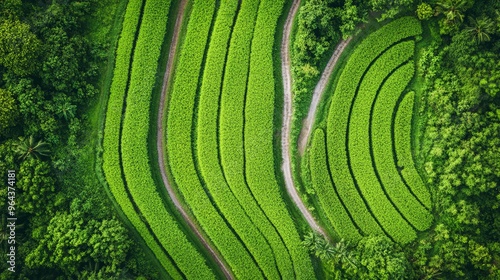 Fototapeta premium Aerial view of lush green rice paddies in a rural landscape.