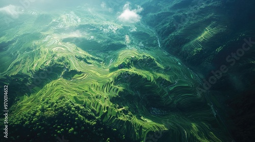 © ShinneProject, Obraz premium Aerial View of Lush Green Rice Terraces.