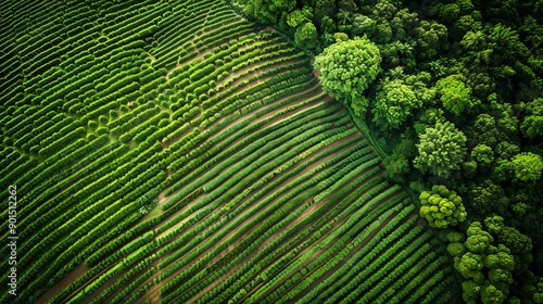 © JT-Dee, Fototapeta premium Aerial view of lush green tea plantation beside a dense forest. The patterns created by rows of tea plants highlight the natural beauty of agriculture.