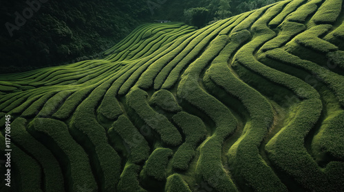© Klay, Fototapeta premium aerial view of lush green terraced farming fields with vibrant patterns