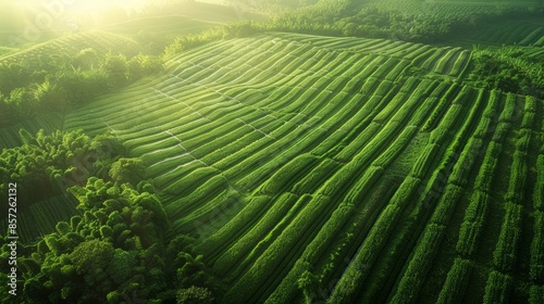 © sri, Fototapeta premium Aerial View of Lush Green Terraced Fields at Sunrise in Tranquil Countryside