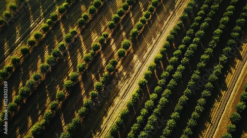 © AssanAI.Studio, Fototapeta premium Aerial View of Lush Green Tree Rows in Sunny Agricultural Field
