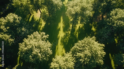 Fototapeta premium Aerial view of lush green trees casting shadows in a vibrant summer park...