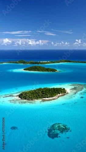 © Aleya, Fototapeta premium Aerial View of Lush Tropical Islands, Turquoise Ocean, and Coral Reefs AI Model