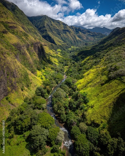 © Rabit, Fototapeta premium Aerial View Of Lush Valley With River Winding Through Green Forest