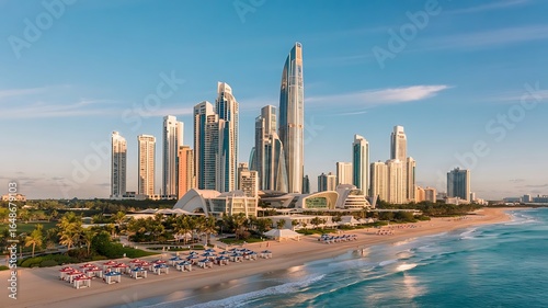 Obraz premium Aerial View of Luxury Beachfront Cityscape with Skyscrapers and Palm Trees