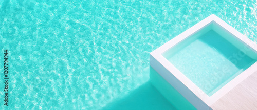 © Rachanon, Fototapeta premium Aerial view of luxury infinity pool with turquoise water, creating serene and tranquil atmosphere. clear water reflects sunlight beautifully, enhancing relaxing vibe
