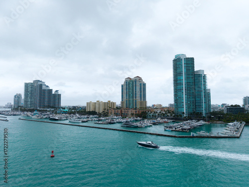 Fototapeta premium Aerial view of luxury yachts in Miami marina. Scenic panorama of boats and skyscrapers in Miami marina.