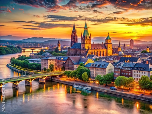 Fototapeta premium Aerial view of Mainz, Germany: a stunning cityscape panorama overlooking the...