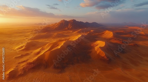 Naklejka premium Aerial view of majestic desert dunes at sunset, showcasing natural beauty and...