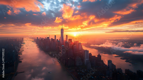 © Siasart Stock, Fototapeta premium Aerial view of Manhattan skyline with a vibrant sunset sky.
