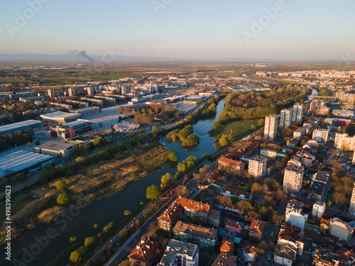 © Stoyan Haytov, Fototapeta premium Aerial view of Maritsa river and panorama to City of Plovdiv, Bulgaria