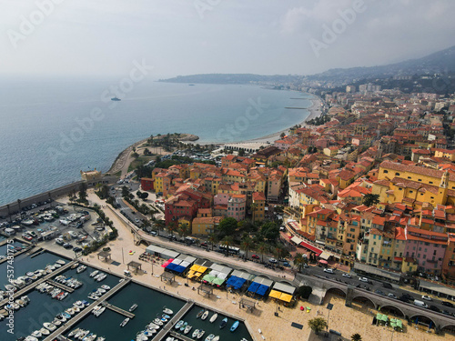 © AerialDronePics, Fototapeta premium Aerial view of Menton in French Riviera from above. Drone view of France Cote d'Azur sand beach beneath the colorful old town of Menton. Small color houses near the border with Italy, Europe.