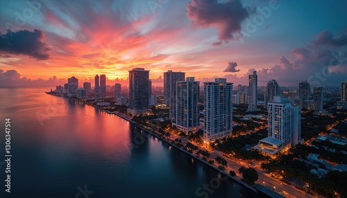 © miss irine, Fototapeta premium Aerial view of Miami skyline at sunset with vibrant orange sky, clouds over water. City buildings, architecture reflected in sea. Urban landscape with city lights on calm evening. Travel destination.