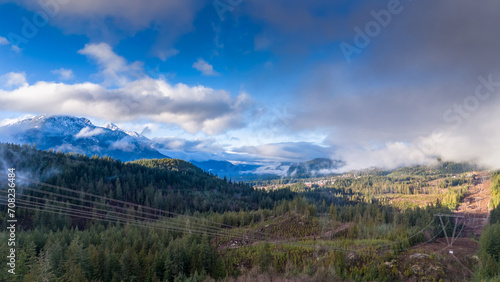 Obraz premium Aerial View of Misty Mountain Landscape and Forest