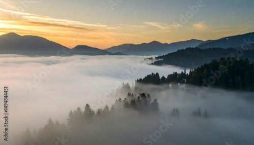 © Aldi, Fototapeta premium Aerial View of Misty Mountain Landscape at Sunrise