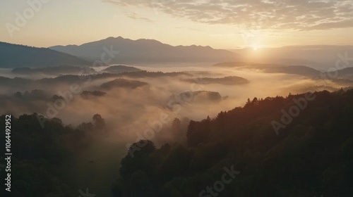 © BWS Stock, Fototapeta premium Aerial view of misty mountains at sunrise