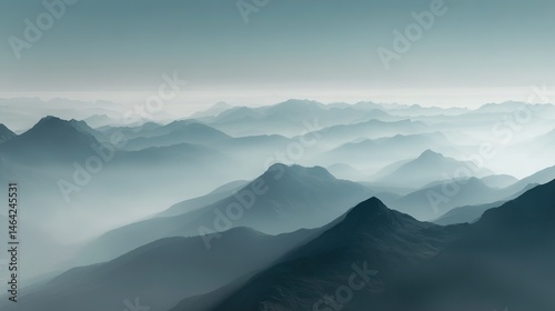 Fototapeta premium Aerial view of misty mountains with soft blue and white sky hues, peaks...