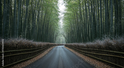 © Letyi, Obraz premium Aerial View of Misty Road Through Dense Bamboo Forest