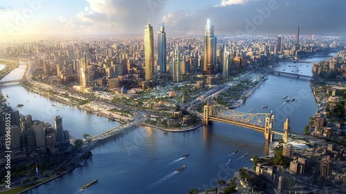 Naklejka premium Aerial view of modern Cairo downtown, showcasing sleek skyscrapers and bustling streets alongside the Nile River, with bridges spanning the water and vibrant city life unfolding