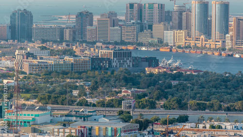 Obraz premium Aerial view of modern city of Dubai with blue sky aerial timelapse