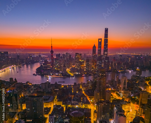 © Shengyi Lu, Obraz premium Aerial view of modern city skyline and buildings at sunrise in Shanghai