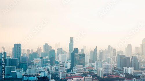 © sommart, Fototapeta premium Aerial view of modern city skyline covered with smog and haze, indicating air pollution and PM2.5 problem. Useful for environmental, climate crisis, urban health, and air quality awareness content.