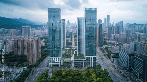 © mas, Fototapeta premium Aerial view of modern city skyline with skyscrapers and green spaces.