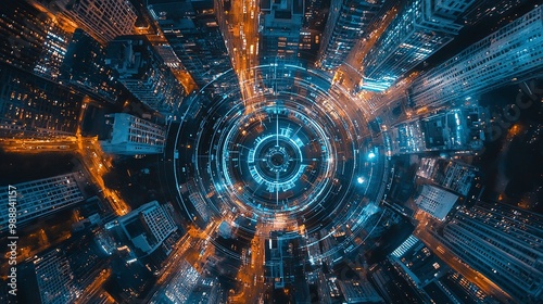 © Tackey, Fototapeta premium Aerial view of modern cityscape at night with vibrant lights.