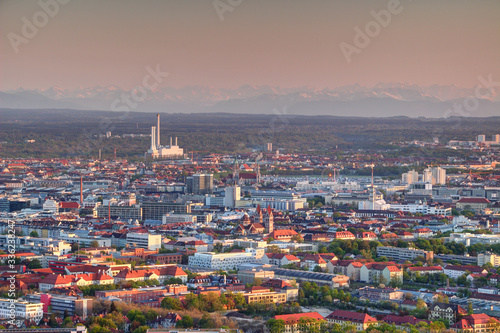 Obraz premium Aerial view of modern European city outskirts in evening light with industrial, commercial and residential buildings, power plant with chimneys and Bavarian Alps in background, Munchen Bayern Germany