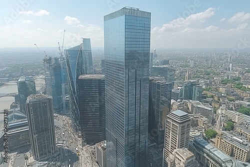 © Iswanto, Fototapeta premium Aerial view of modern skyscrapers in a bustling urban environment.