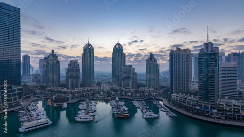 Obraz premium Aerial view of modern skyscrapers night to day timelapse before sunrise in Dubai Marina in Dubai, UAE.