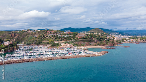 © Ioan, Fototapeta premium Aerial view of Mount Turnei, located on the French Riviera. Photography was shot from a drone at a higher altitude from above the water wit the beautiful marina and beach in the view.