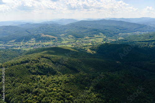 © bilanol, Fototapeta premium Aerial view of mountain hills covered with dense green lush woods on bright summer day