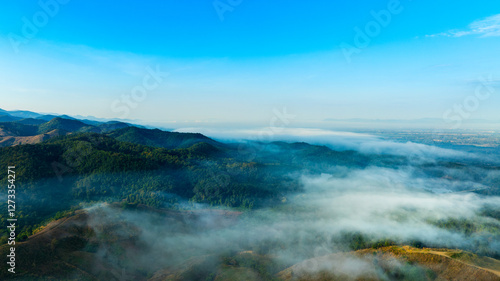 © Photo Sesaon, Fototapeta premium Aerial view of mountains and mixed forest. Green deciduous trees with mist clouds. The rich natural ecosystem of the rainforest concept is about conservation and natural reforestation.