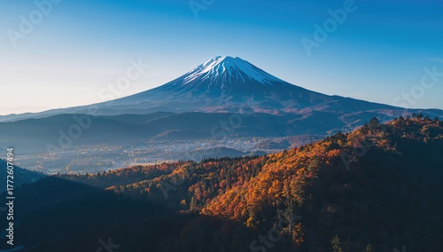 Fototapeta premium Aerial view of mountains with autumn foliage and a blue sky, showcasing seasonal change