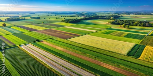 © Buakung, Fototapeta premium Aerial view of neatly organized crop rows in a rural farming area with lush green fields and clear blue sky, showcasing the beauty of agriculture and nature , countryside, farm