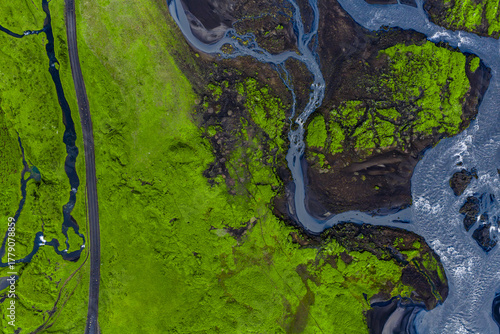 Fototapeta premium Aerial view of neon green moss on dark lava with braided streams near Vik,...