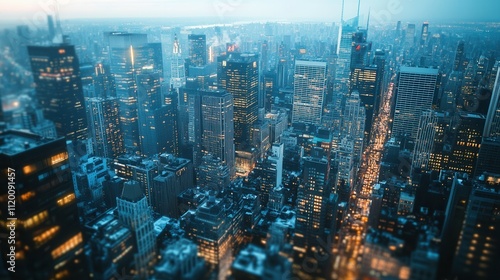 Obraz premium Aerial view of new york city skyline at dusk featuring illuminated skyscrapers and urban landscape.